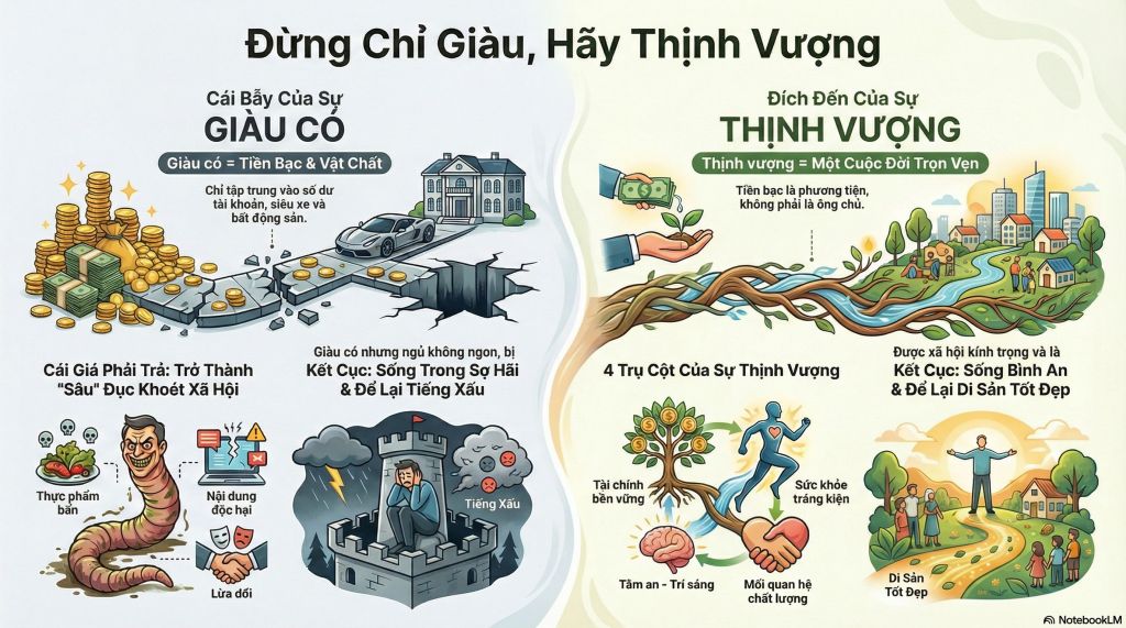 Nếu Giàu có là sở hữu nhiều tiền, thì Thịnh vượng là sở hữu một cuộc đời trọn vẹn. Thịnh vượng không loại trừ tiền bạc, nhưng nó đặt tiền bạc về đúng vị trí: Là phương tiện, không phải ông chủ.