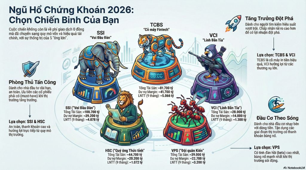 Tháng 1/2026, nhìn lại năm tài chính 2025 đầy biến động nhưng thăng hoa, ngành chứng khoán Việt Nam đã chính thức bước vào giai đoạn phân hóa cực độ. "Miếng bánh" thị phần không còn chia đều cho hàng trăm công ty nhỏ lẻ. Năm cái tên VPS, SSI, TCBS, VCI, HSC đã thiết lập một trật tự mới, nắm giữ "yết hầu" của dòng tiền thị trường.